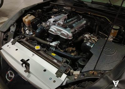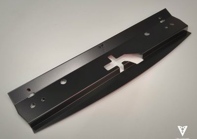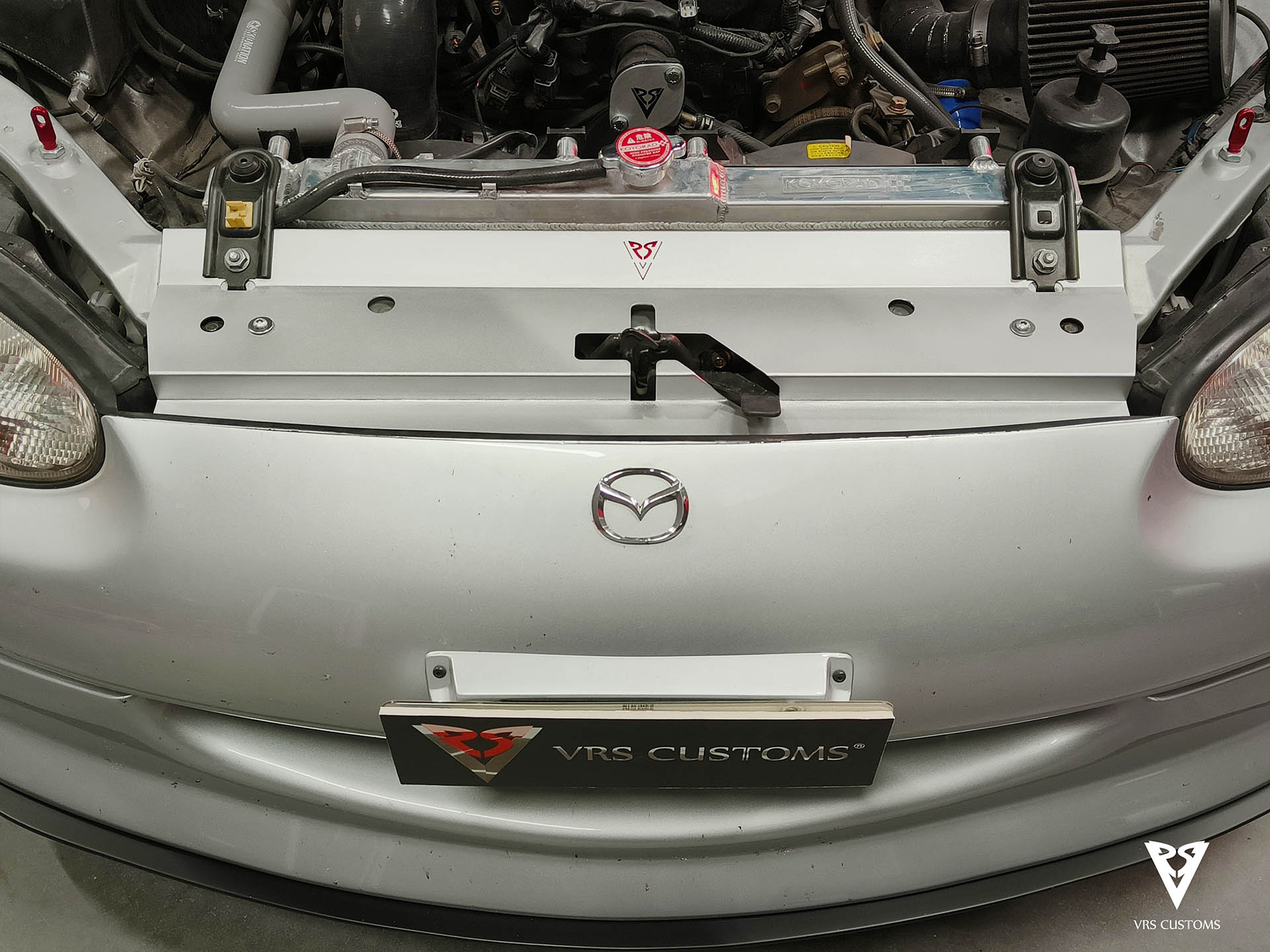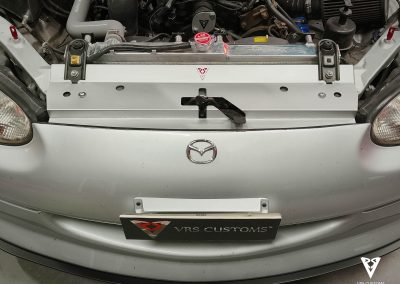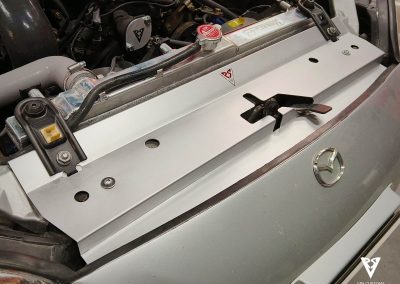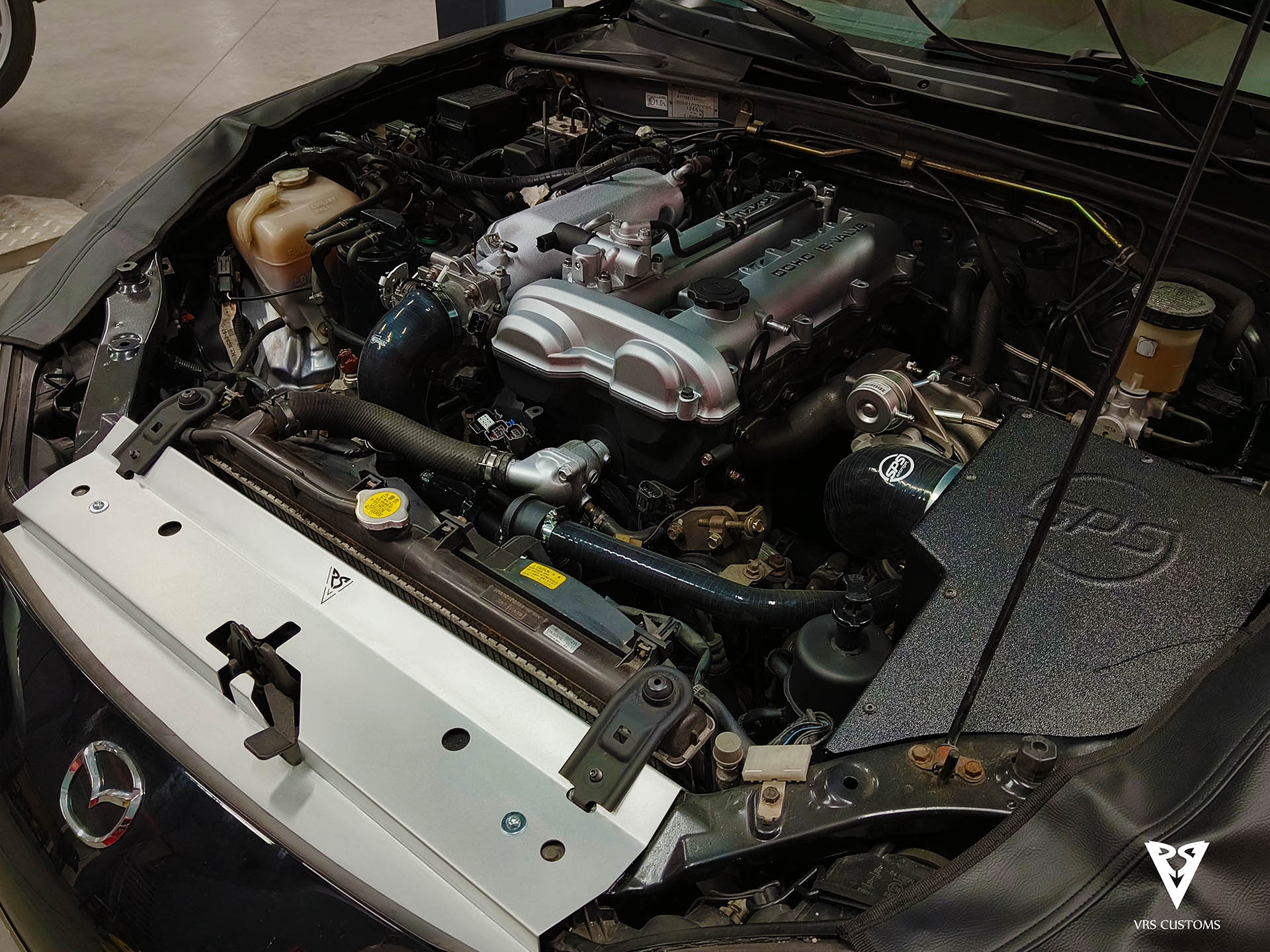 Specific cooling plate for Mazda MX5 NB. Manufactured in 1.5 mm thick laser-cut aluminium with a satin aluminium finish or satin black powder coating. Also available in 1.5 mm thick carbon fibre with a gloss finish.