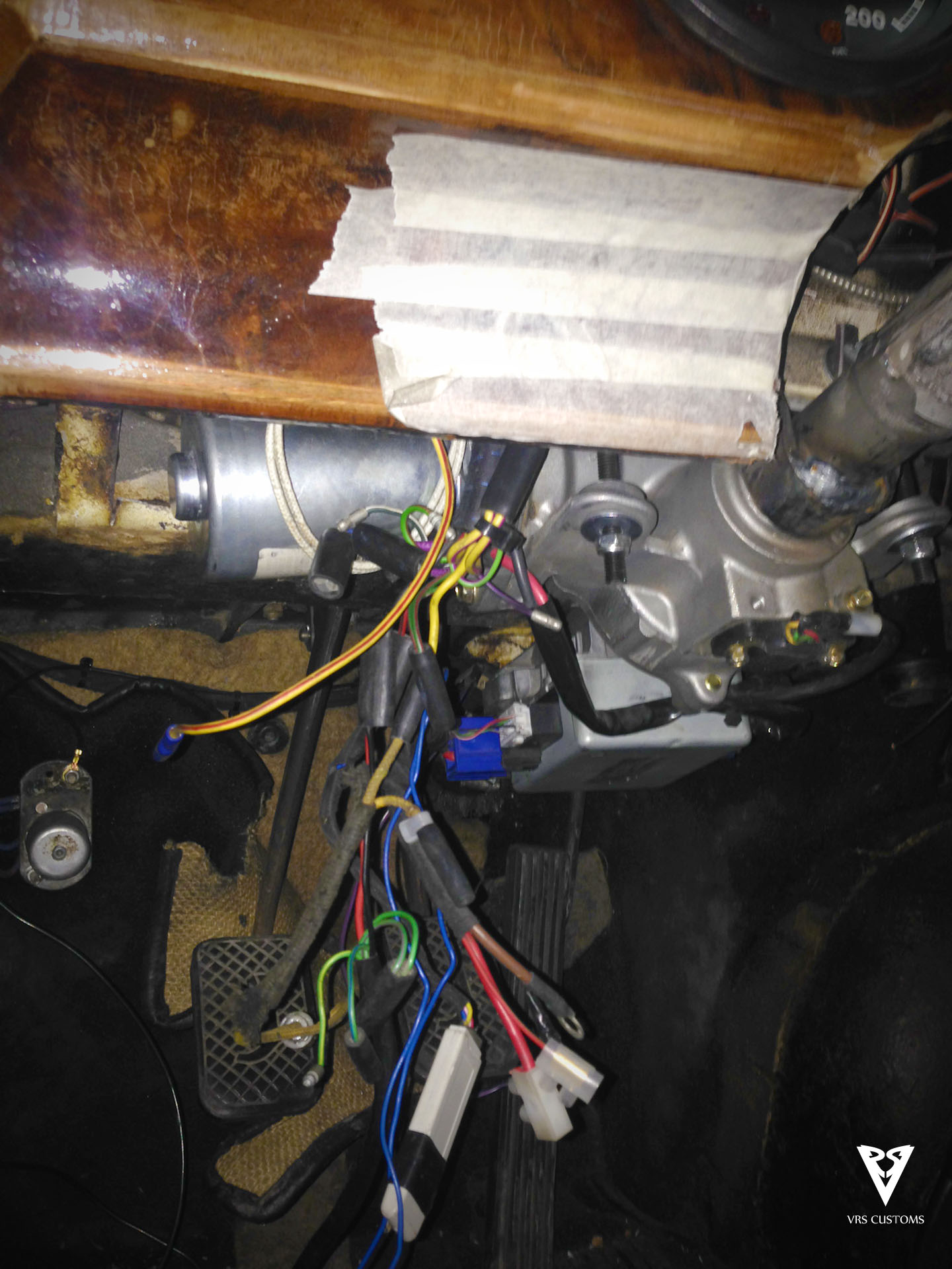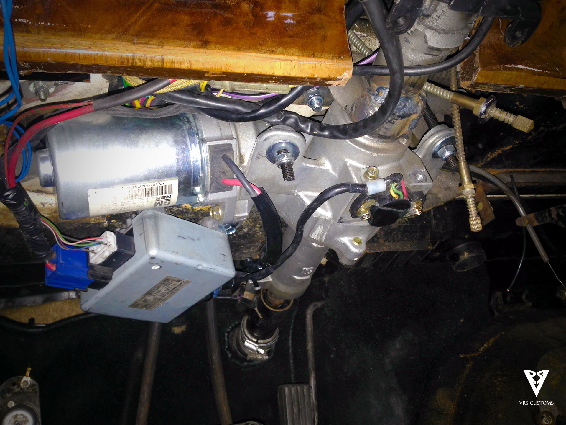 A primera vista nos encontramos con varias cosas que habrá que modificar. Físicamente no hay sitio donde alojar el nuevo conjunto de dirección, por lo que habrá que cortar partes del chasis bajo el salpicadero, fabricar soportes y anclajes y buscarle una posición lo menos entorpecedora posible para el conductor.