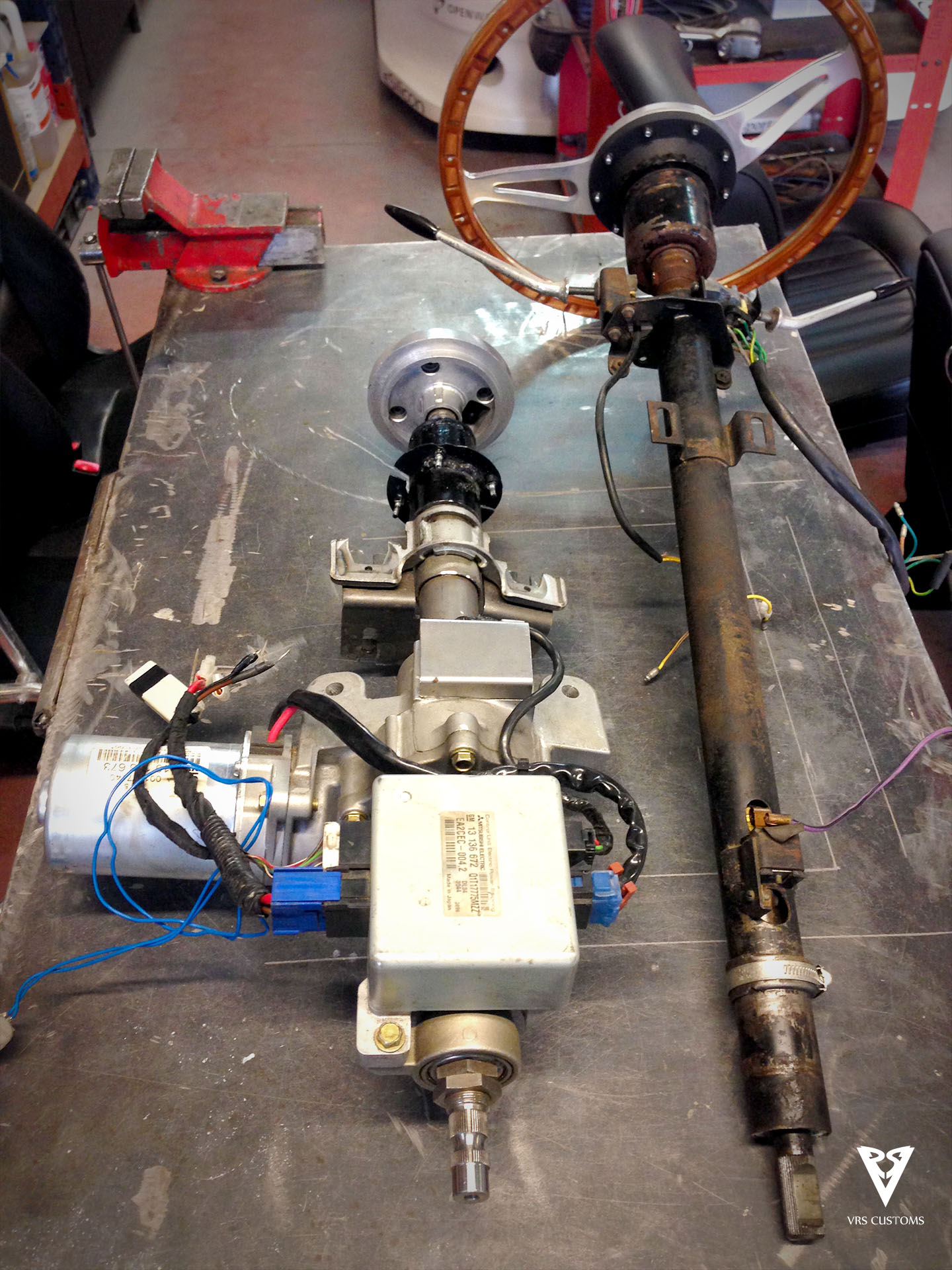 El paso de los años y la dirección tan dura de éste coche hacen que no pueda ser un motivo de disfrute sacar de paseo ésta fantástica joya. Para ello le instalaremos una dirección asistida eléctrica de un Opel Corsa del año 2002, con todo lo que ello conlleva: adaptar, fabricar, inventar… hacer que todo quede en su sitio, sin alteraciones, lo más stock posible, sin modificar la comodidad del puesto de conducción.